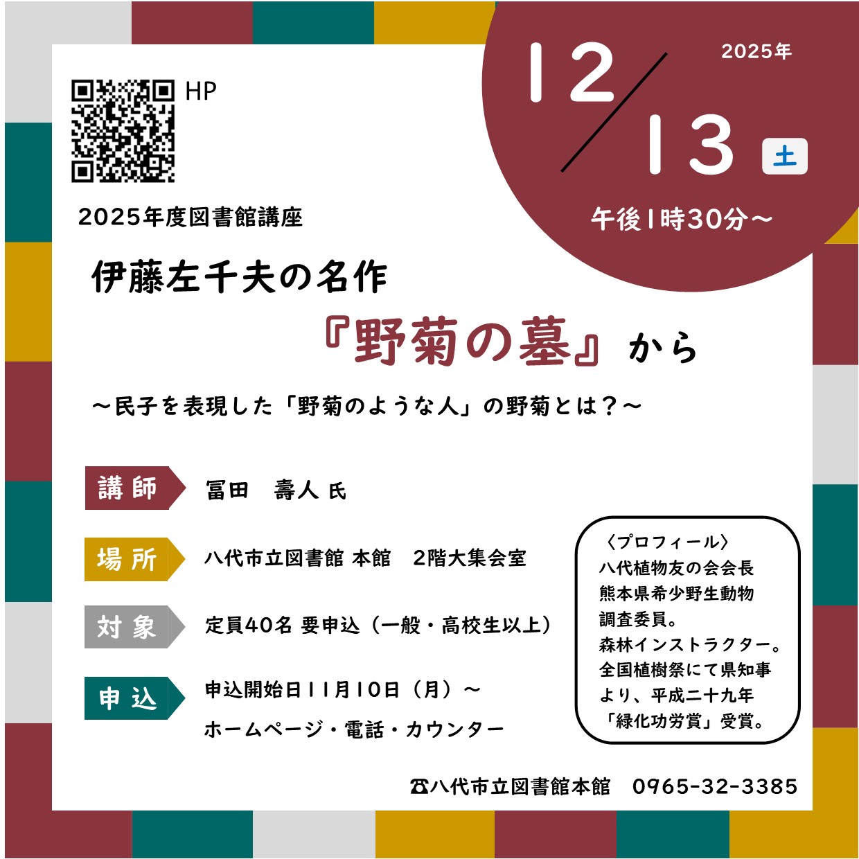 八代市立図書館本館にて、 図書館講座「伊藤左千夫の名作『野菊の墓』から~民子を表現した「野菊のような人」の野菊とは?~」 を開催します。