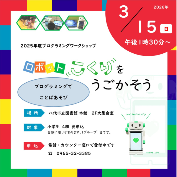 八代市立図書館本館にて、図書館講座「ロボットこくりをうごかそう ~プログラミングでことばあそび~」を開催します。