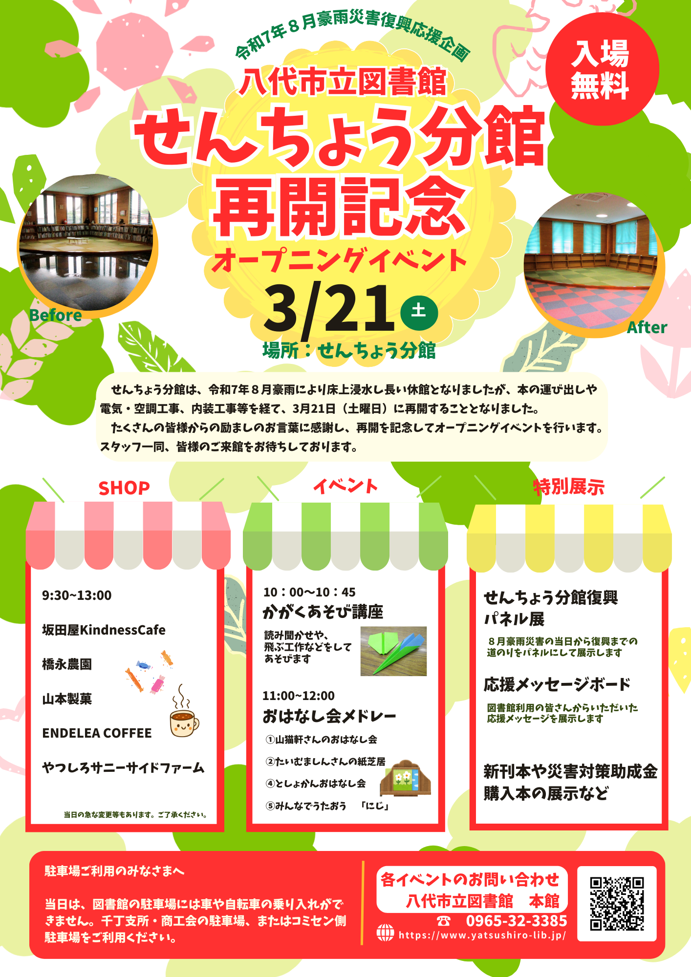 令和7年8月豪雨災害により休館していた八代市立図書館せんちょう分館が3月21日(土曜日)に再開します。