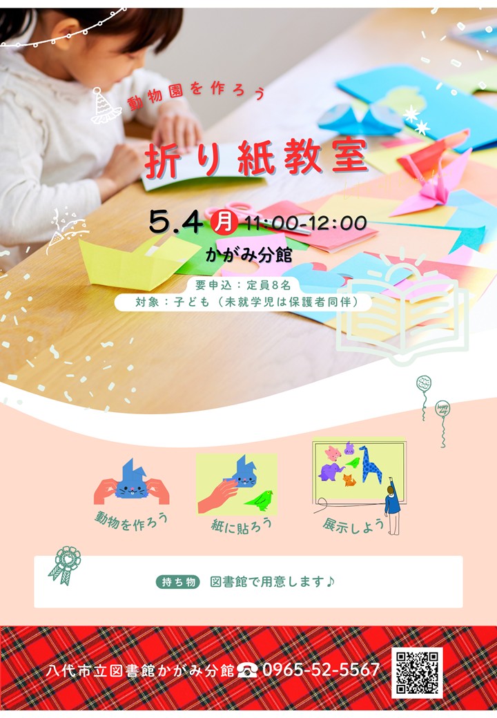 5月4日(月祝)開催【かがみ分館】図書館講座「折り紙教室 ~動物園をつくろう~ 」